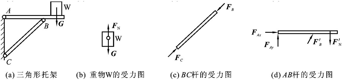 【例2-6】 如图2-28(a)所示的三角形托架,A、C处为固定铰支座,两杆在B点用铰相连,试画出重物W、BC杆和AB杆的受力图。
