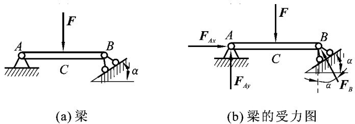 (3)画出梁AB上的主动力和约束反力。如图2-27(b)所示,A端为固定铰支座,约束反力用两个正交分力FAx、FAy表示,指向为假定的。B处活动铰支座的约束反力用FB表示,沿支承面的法线方向,指向为假定的。
