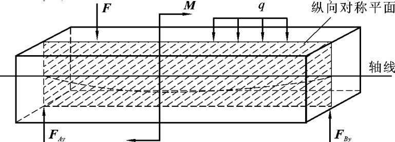 工程中常见的梁,其截面内都具有一根对称轴,这根对称轴与梁的轴线所组成的平面,称为梁的纵向对称面,如图3-8所示。当梁上所有外力(包括荷载和反力)均作用在此纵向对称面内时,梁轴线变形后的曲线也在此纵向对称面内,这种弯曲称为平面弯曲。平面弯曲是工程中最常见也是最基本的弯曲变形。