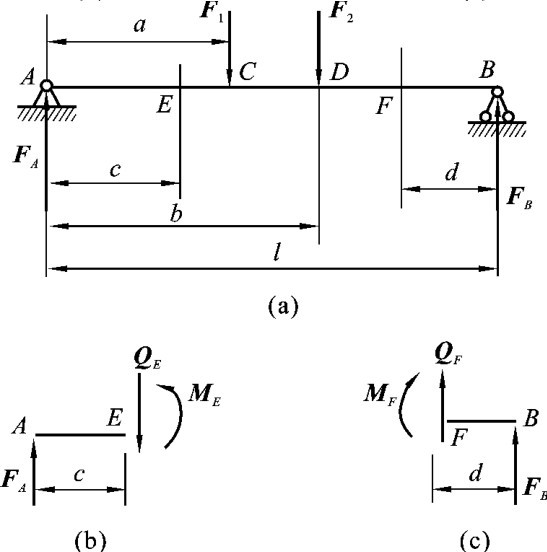 【例3-3】 如图3-12(a)所示梁的计算简图。已知F1=10kN,F2=20kN,a=2m,b=3 m,c=1.5m,d=1m和l=5m。试求梁在E、F点处截面的剪力和弯矩。