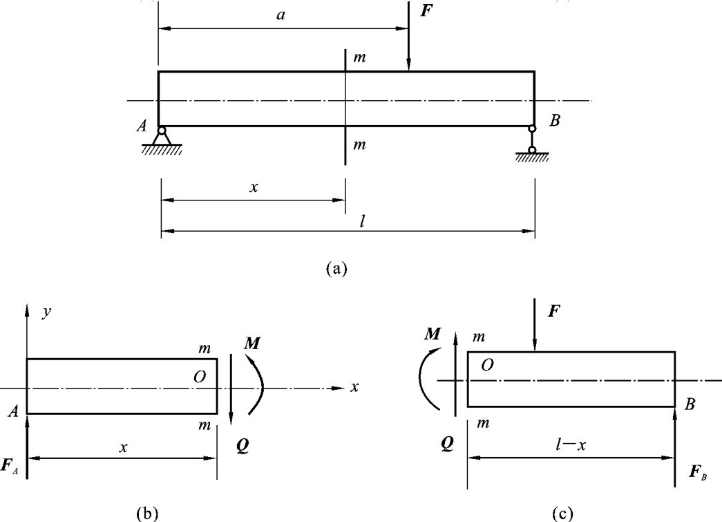如图3-10(a)所示为一受集中力作用的简支梁,荷载F和支座反力FA、FB是作用在梁的纵向对称面内的平衡力系,现用截面法求其任意截面m—m上的内力。