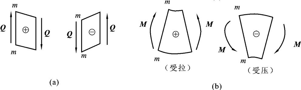 为了使由左右两段梁求出的截面m—m上的剪力Q和弯矩M不仅大小相等,而且正负号一致,并考虑土建工程的习惯要求,通常根据变形来规定Q、M的正负号。