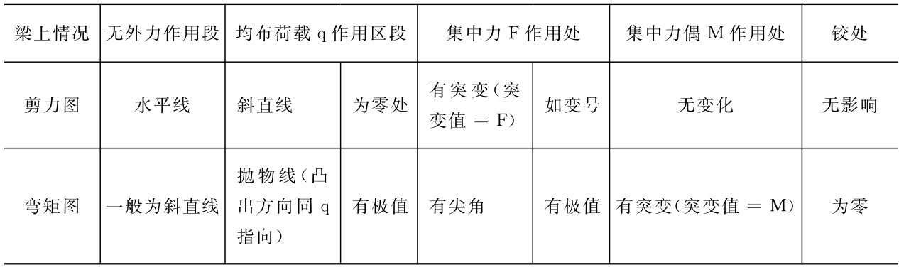例3-4、例3-5、例3-6分别绘制了简支梁在均布荷载、集中力、集中力偶作用下的内力图。读者可自行利用前文提到的内力方程法绘制悬臂梁和外伸梁在不同外力作用下的内力图。