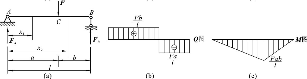 【例3-5】 简支梁受到集中力F的作用,如图3-14(a)所示,绘制该梁的剪力图和弯矩图。