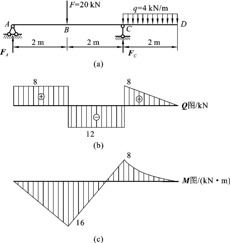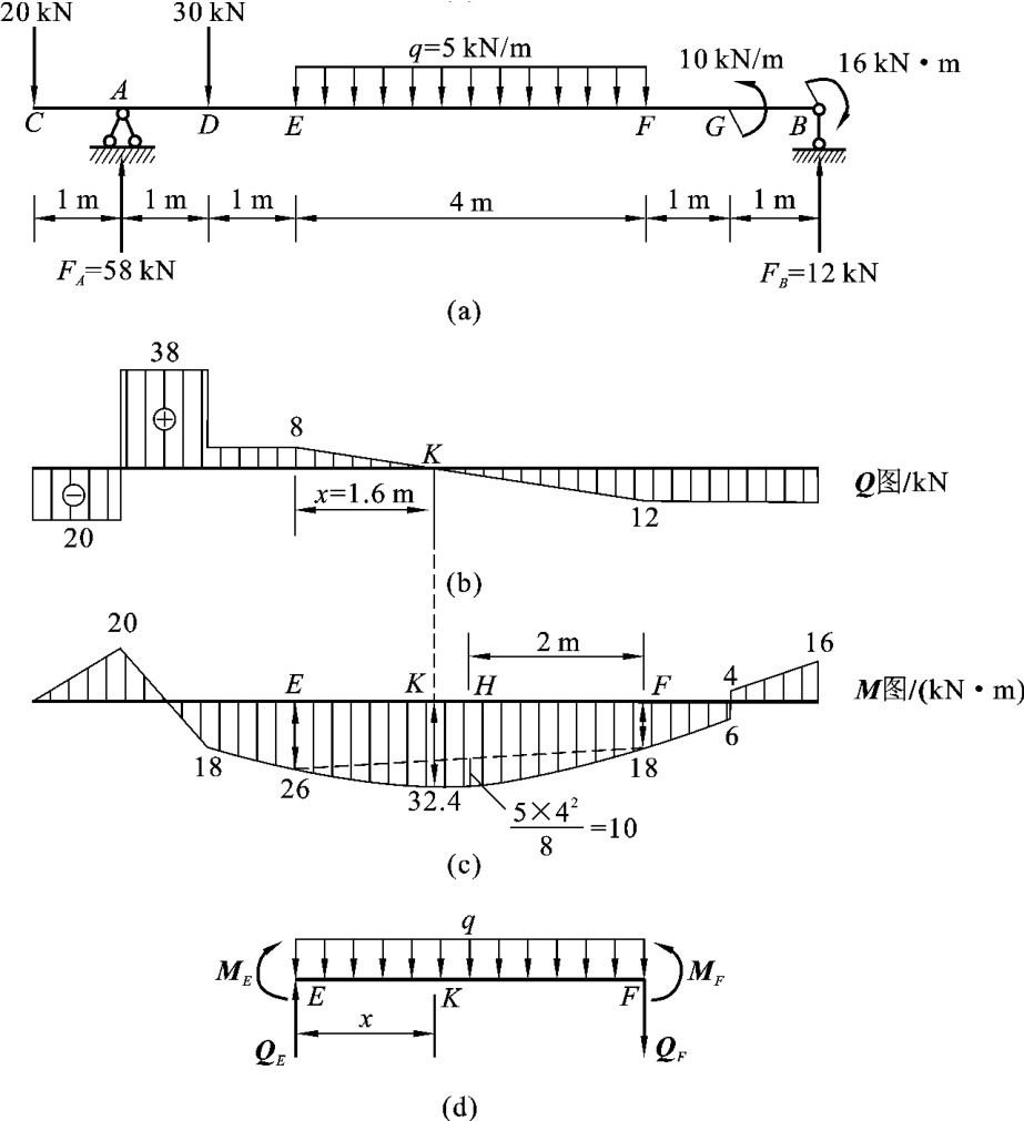 EG段:此梁段无荷载作用,且剪力为负,弯矩图为向上倾斜的直线。G点左侧截面上的弯矩为MG左=[FA×10-(20×8)-(15×4×4)]kN·m=40kN·m。