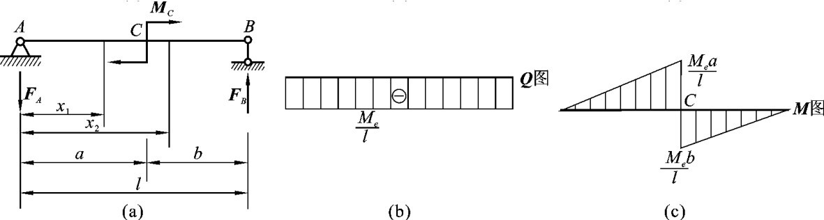 【例3-6】 简支梁受到集中力偶Me的作用,如图3-15(a)所示,绘制该梁的剪力图和弯矩图。