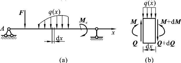 有一简支梁受到任意的分布荷载、集中力、集中力偶的作用。取A点为坐标原点,x轴以向右为正,如图3-16(a)所示。现取分布荷载作用下的一微段dx来进行研究。