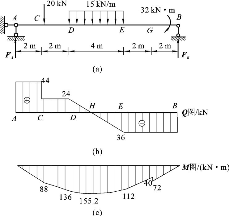 EB段:EG段和GB段上无荷载作用,横截面G上受集中力偶作用,因集中力偶对剪力图没有影响,所以EB段的剪力图为水平线。QE=QB=(44-20-15×4)kN=-36kN。全梁剪力图如图3-18(b)所示。
