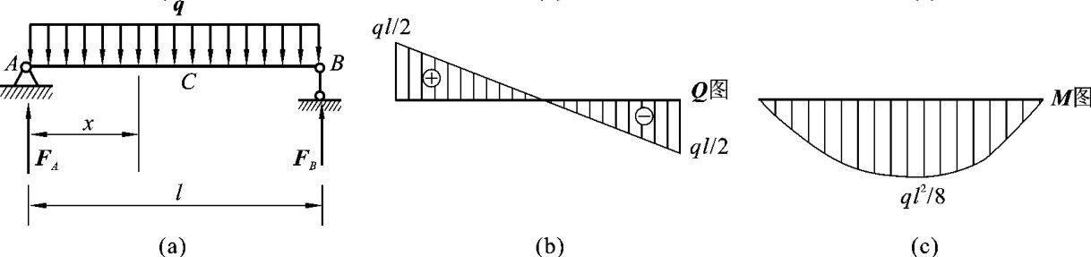 【例3-4】 简支梁受到均布荷载q的作用,如图3-13(a)所示,绘制该梁的剪力图和弯矩图。