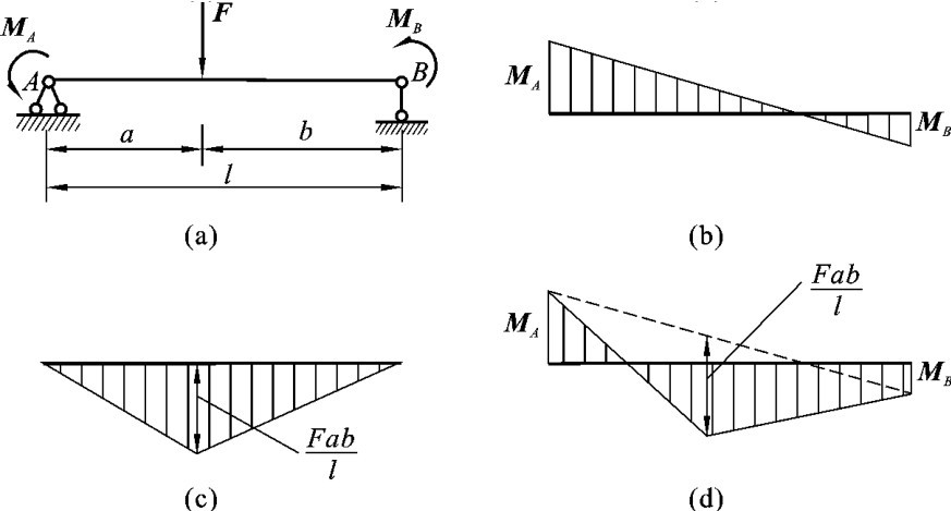应当注意的是,这里所描述的弯矩图的叠加,并非是两个图形的简单拼合,而是指纵坐标的叠加。在实际作图时,通常不必作出图3-19(b)和图3-19(c),而可直接作出图3-19(d)。方法是:先将两端弯矩MA、MB绘出并连成直线,如图3-19(d)中虚线所示,然后以此虚线为基线叠加上简支梁在集中力F作用下的弯矩图。因为这里的弯矩图的叠加,是指纵坐标的叠加,所以图3-19(d)所示的中点竖标值
