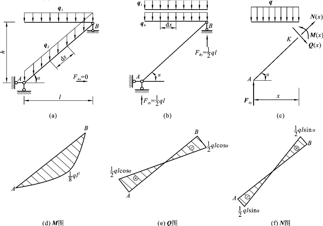 在工程中,经常会遇到轴线倾斜的梁,这种梁称为斜梁,如楼梯梁、锯齿形楼盖等。计算斜梁的内力仍采用截面法,内力图的绘制和水平梁类似。斜梁所承受的荷载主要有两种:一种是沿斜梁水平投影长度分布的荷载,例如楼梯上人群的重量等;另一种是沿斜梁轴线方向分布的竖向荷载,例如梁的自重等。