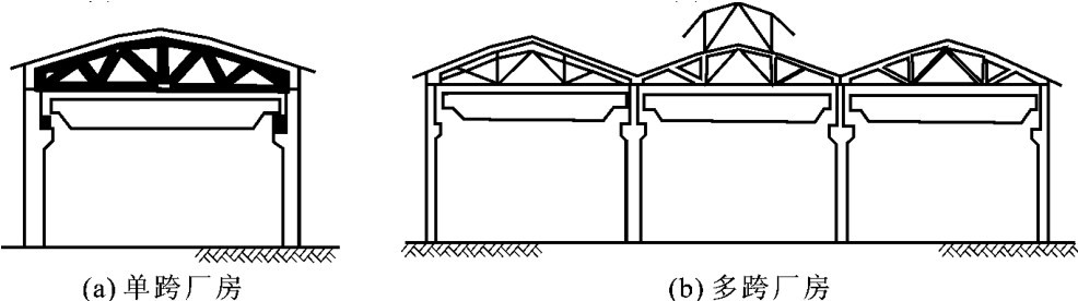 如图3-29所示的工业厂房,因为工业厂房通常都是跨度、高度、承受的荷载都比较大的建筑,因此通常采用图示的骨架承重结构,使各种构件连接为一体,组成一个完整的结构空间,以保证厂房的坚固耐用。