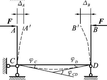 上述线位移和角位移称为绝对位移。除此之外,如图4-4所示的刚架,在荷载作用下发生了虚线所示变形,截面C的角位移为φC(顺时针方向),截面D的角位移φD(逆时针方向),这两个截面的方向相反的角位移之和,就构成了截面C、D的相对角位移,并表示为φCD=φC+φD。同样,在荷载作用下,A点移至A′点,B点移至B′点,A点的水平位移为ΔA(向右),B点的水平位移为ΔB(向左),这两个方向相反的水平位移之和就称为A、B两点的水平相对线位移,并用ΔAB=ΔA+ΔB来表示。为了方便起见,我们将绝对位移和相对位移统称为广义位移。