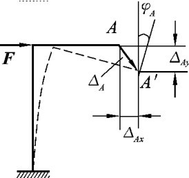 结构的位移分线位移和角位移两种。如图4-3所示的刚架,在荷载作用下发生如虚线所示的变形,使截面A的形心从A点移动到了A′点,那么线段AA′称为A点的线位移,记作ΔA。若将ΔA沿水平和竖向分解,则其水平分量ΔAx称为A点的水平线位移,竖向分量ΔAy称为A点的竖向线位移。同时截面A转动了一个角度,称为截面A的角位移,用φA表示。