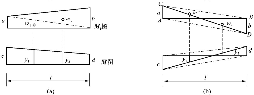 图是折线图形,故应采用分段图乘再叠加的方法,又因两个弯矩图均匀对称,故只要计算一半再取两倍即可。