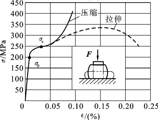 当应力超过屈服极限后,受压的曲线不断上升,其原因是试件的截面不断增加,由鼓形最后变成了薄饼形。