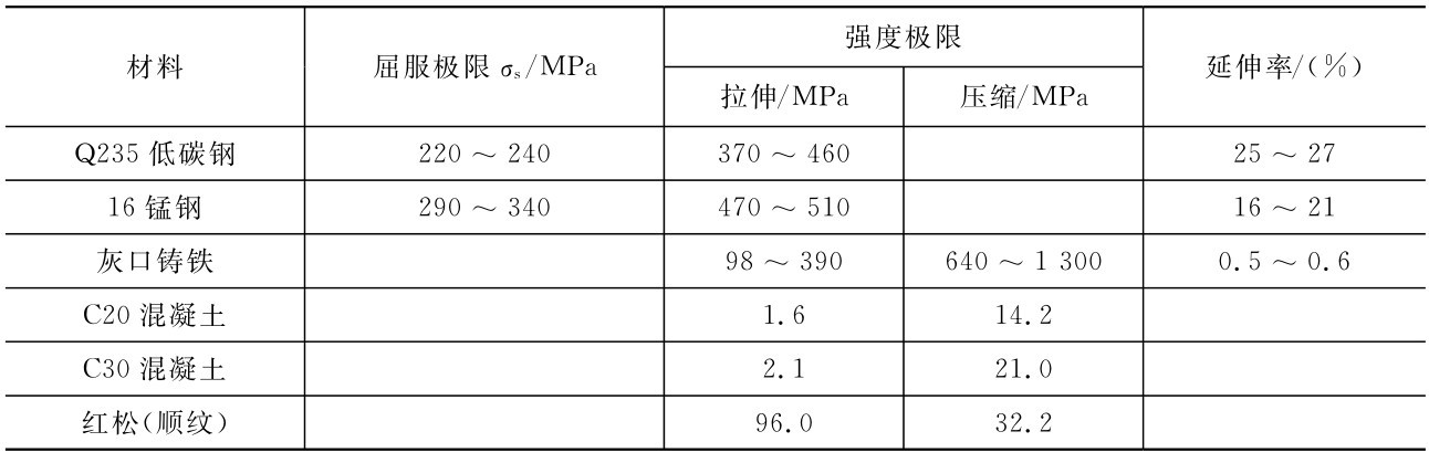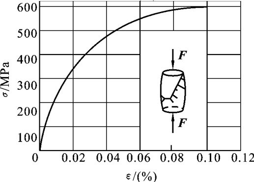 铸铁的压缩试验表明:在应力-应变的关系曲线上,没有明显的直线部分,也没有屈服阶段。强度极限σb可以测得,其值一般为受拉时的强度极限的4~5倍,试件破坏时,沿着接近于45°的斜面上裂开,如图5-4所示,这说明铸铁的抗剪强度低于抗压强度。表5-1列出了几种常用材料在常温与静载下的力学性能,以供参考。