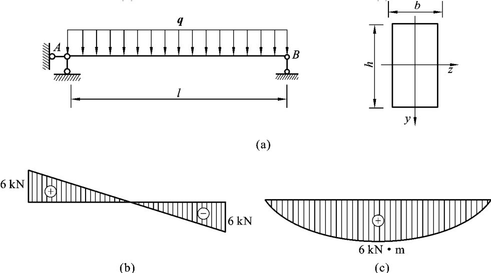 【例5-12】 如图5-19(a)所示为一简支木梁,承受均布荷载q=3kN/m,梁的跨度l=4m,截面尺寸为b×h=120mm×180mm,材料的许用正应力[σ]=10MPa,许用切应力[τ]=1. 1MPa。试校核此梁的强度。