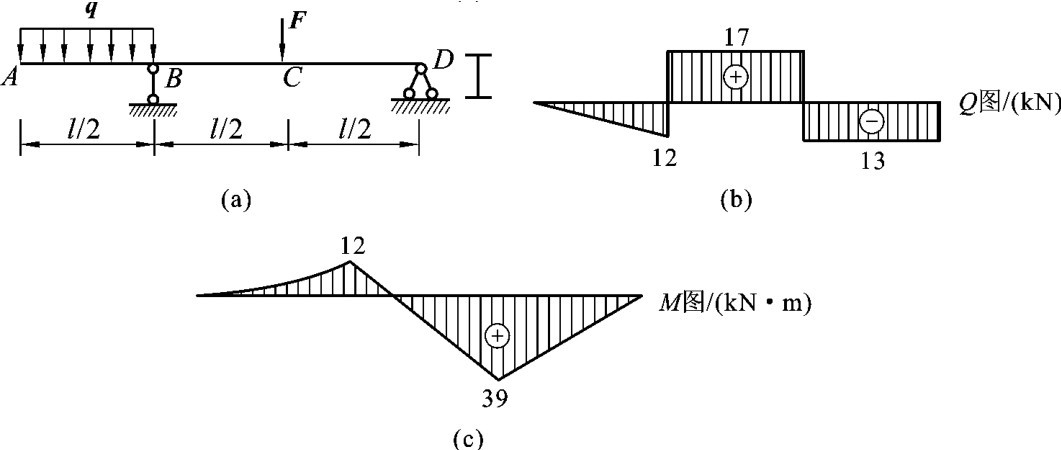 AB梁的剪力图和弯矩图分别如图5-19(b)、(c)所示,梁的最大剪力发生在靠近支座的截面上。