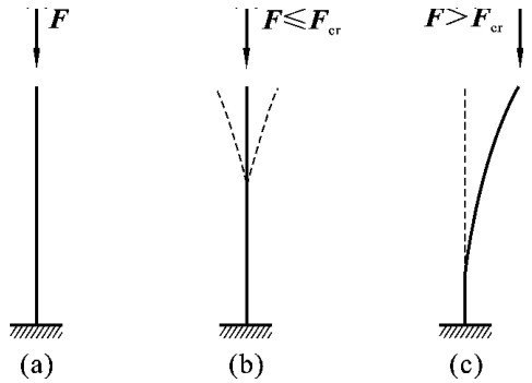 由上述可知,压杆的直线平衡状态是否稳定,与压力F的大小有关。当压力F逐渐增大至某一特定值Fcr时,压杆将从稳定平衡状态过渡到不稳定平衡状态,此时称为临界平衡状态。而压力Fcr称为压杆的临界力。