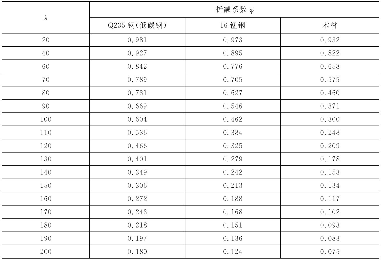 式(5-22)就是按折减系数法进行压杆稳定计算的稳定条件。式中,φ是随λ值变化而变化的,即给定一个λ值,就对应一个φ值。工程上为了应用方便,在有关结构设计规范中都列出了常用建筑材料λ随φ变化而变化的φ值,现摘录一部分制成表5-4以便查阅。