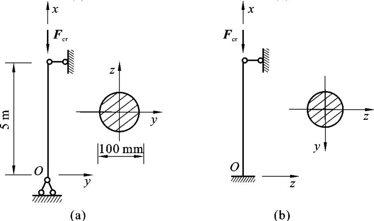 【例5-18】 一长l=5m,直径d=100mm的细长钢压杆,支承情况如图5-27所示,平面内为两端铰支,在xy平面内为一端铰支一端固定。已知钢的弹性模量E=200GPa,求此钢压杆的临界力。