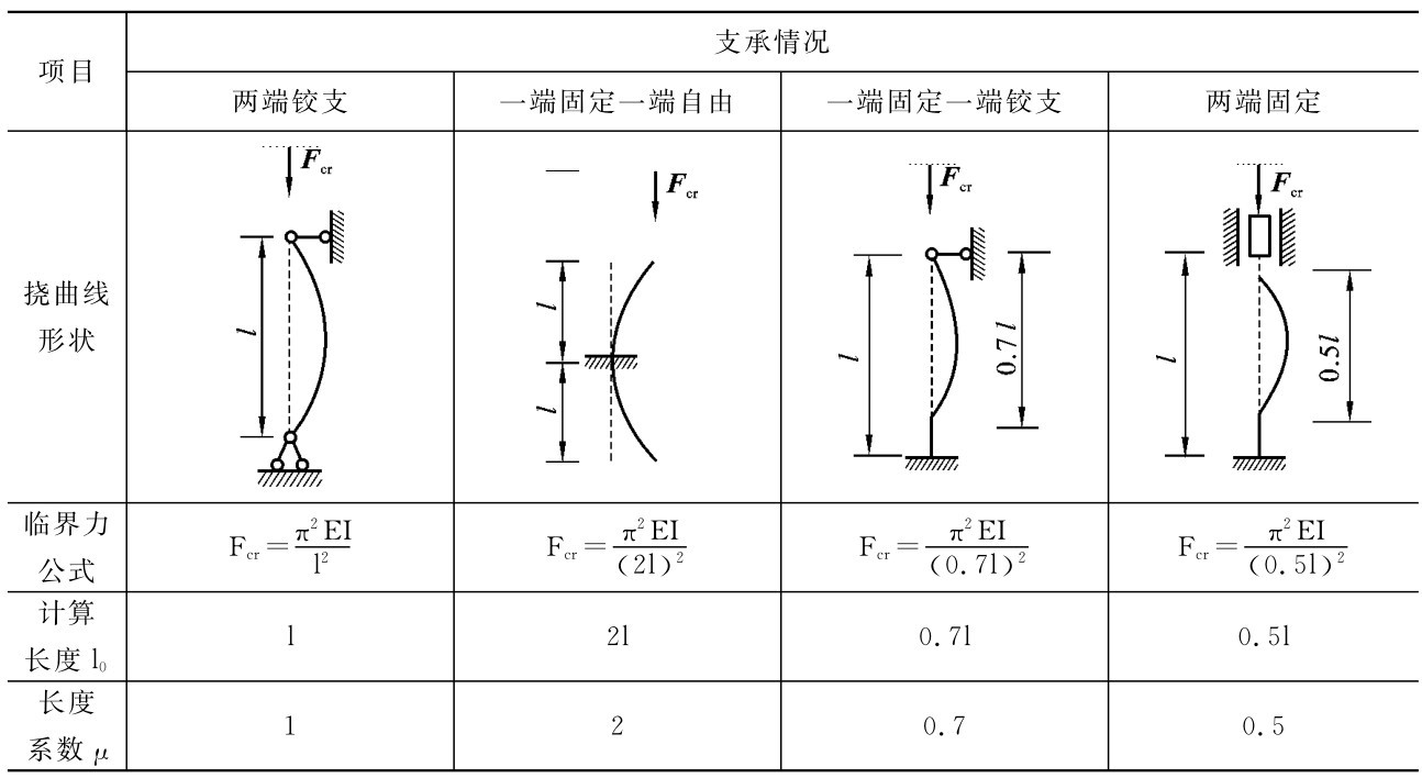 表5-2 常见支承情况下等截面细长压杆临界力的欧拉公式