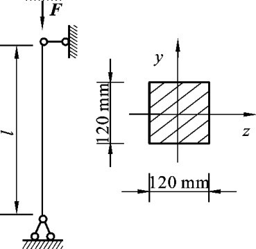 【例5-20】 如图5-29所示,两端铰支的正方形截面a=120mm的木杆,所受轴向压力F=30kN,杆长l=4m,许用应力[σ]=10MPa。试校核该压杆的稳定性。