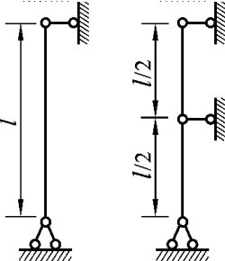 在其他条件相同的情况下,杆长l越短,则λ越小,临界应力就越高。因此,减小杆长显然提高了压杆的稳定性。可以通过改变结构或增加支点来减小杆长。如图5-31所示两端铰支的细长压杆,若在中点处增加一支承,则其计算长度为原来的一半,柔度即为原来的一半,而它的临界应力却是原来的4倍。