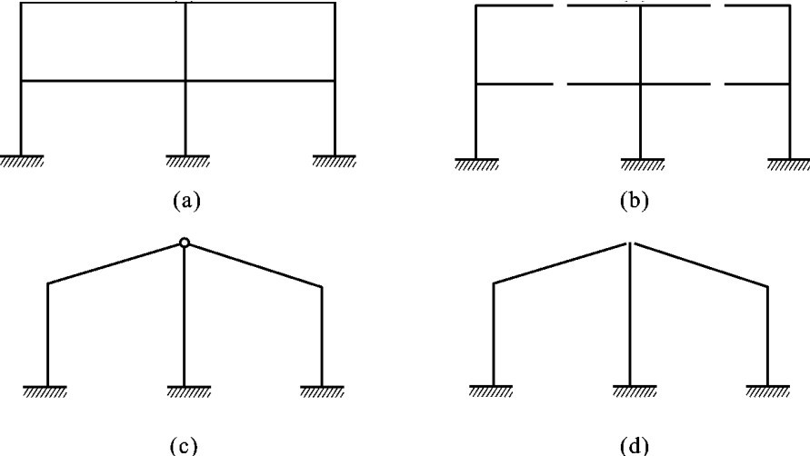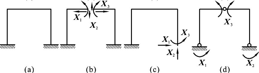 如图6-10(a)所示的多跨多层刚架,将每一个封闭框格的横梁切断,共去掉3×4=12个多余联系后,变成如图6-10(b)所示的静定结构,所以它是12次超静定的结构。如图6-10(c)所示的刚架,将顶部的复铰(相当于两个单铰)去掉后,变成如图6-10(d)所示的静定结构,所以它是4次超静定的结构。