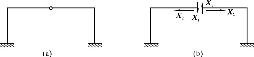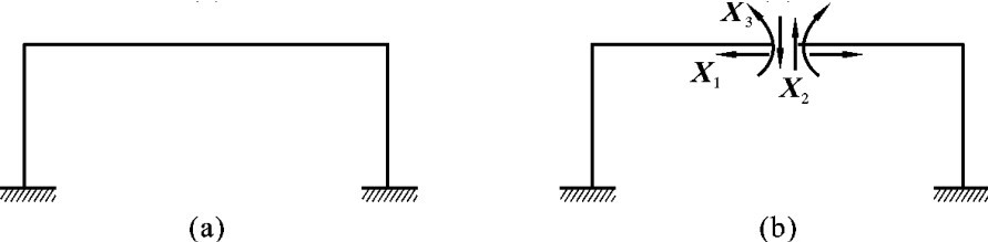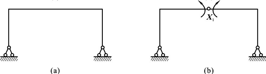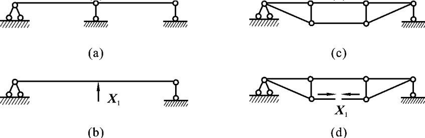 (1)去掉支座处的一根支杆或切断一根链杆,相当于去掉一个联系。如图6-4所示的结构就是一次超静定结构,图中原结构的多余联系去掉后用未知力X1来代替。