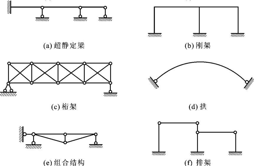 图6-3给出了工程中常见的几种超静定梁、刚架、桁架、拱、组合结构和排架。本章讨论如何用力法计算这种类型的结构。
