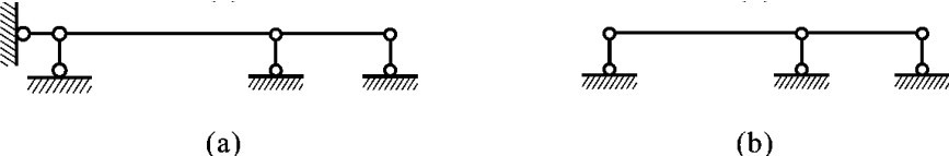 应用上述去掉多余联系的基本方式,可以确定结构的超静定次数。应该指出,同一个超静定结构,可以采用不同方式去掉多余联系,图6-8(a)可以有三种不同的去约束方法,分别如图6-8(b)、(c)、(d)所示。无论采用何种方式,原结构的超静定次数都是相同的,所以说去约束的方式不是唯一的。这里面所说的去掉“多余联系”(或“多余约束”),是以保证结构是几何不变体系为前提的。如图6-9(a)所示中的水平约束就不能去掉,因为它是使这个结构保持几何不变的“必要约束”(或“必要联系”)。如果去掉水平链杆(见图6-9(b)),则原体系就变成几何可变结构了。