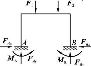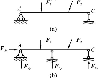 现在,我们要讨论的是超静定结构。它同样可以从两个方面来定义:从几何组成的角度来定义,超静定结构就是具有多余联系的几何不变体系;从受力的角度来定义,超静定结构就是只用静力平衡方程不能求出全部的反力和内力的结构。如图6-1(a)所示的简支梁是静定结构,当跨度增加时,其内力和变形都将迅速增加。为减少梁的内力和变形,在梁的中部增加一个支座,如图6-1(b)所示,从几何组成的角度分析,它就变成具有一个多余联系的结构,我们只用静力平衡方程就不能求出全部支座反力(FAx、FAy、FBy和FCy)和内力。具有多余约束、仅用静力平衡条件不能求出全部支座反力和内力的结构称为超静定结构。图6-1(b)和图6-2所示的连续梁和刚架都是超静定结构。