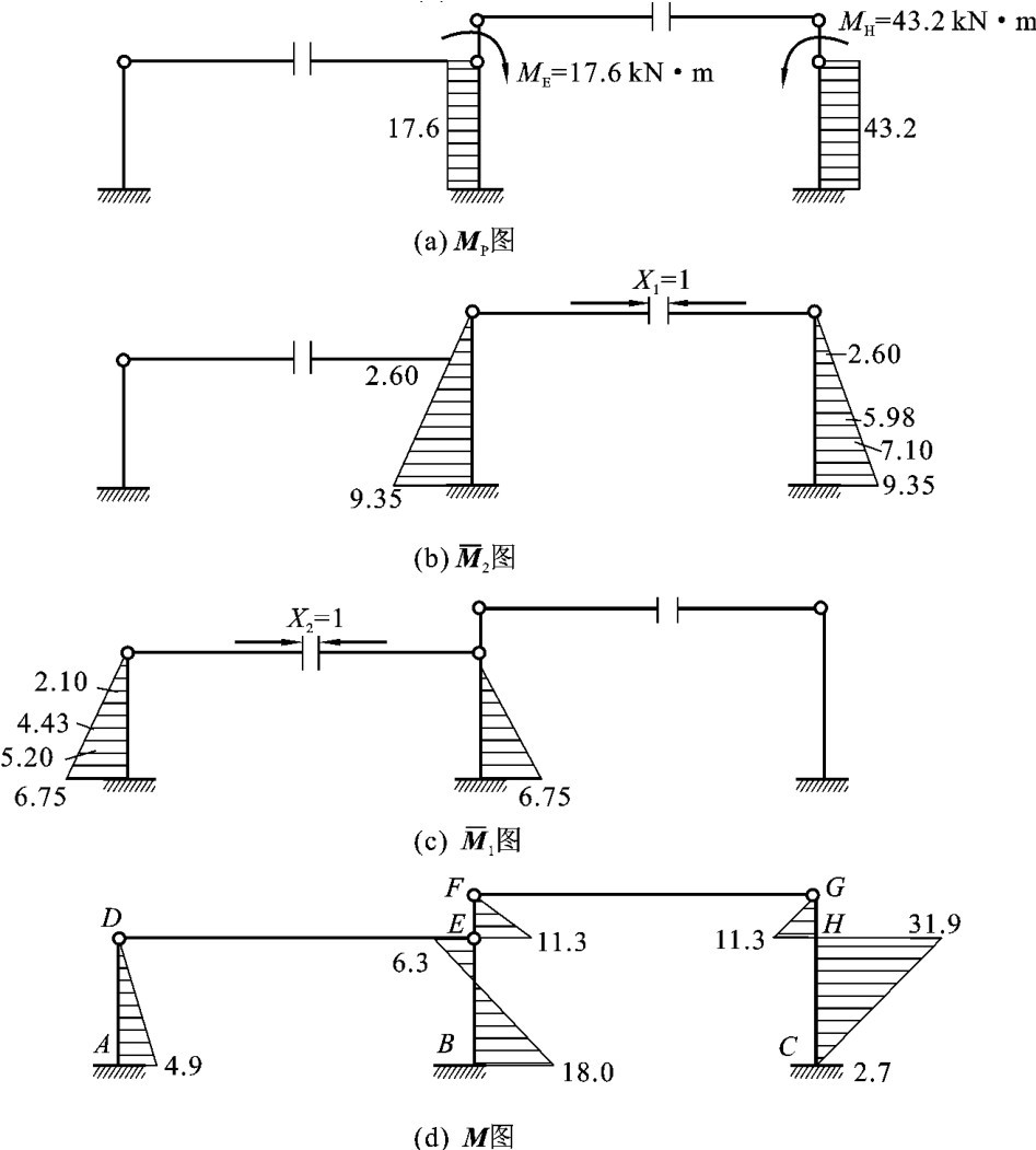 从力法方程中解出多余力Xi(i=1,2,…,n)后,即可按照静定结构的分析方法求原结构的反力和内力,或者按下述叠加公式求出弯矩