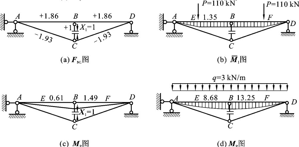 (2)计算δ11和Δ1P时,只考虑轴向变形的影响。计算半个桁架的变形时,EF杆长度可取其一半长度。最后结果为半个桁架杆件变形总和的两倍。