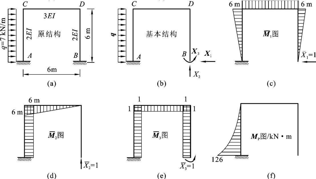 图和MP图,求出系数和自由项,解出X1并作出M图,如图6-12(f)所示。应该指出:不论选用哪种基本结构,力法方程的形式都是不变的,但是力法方程中的系数和自由项的物理意义与数值的大小可能会不同。