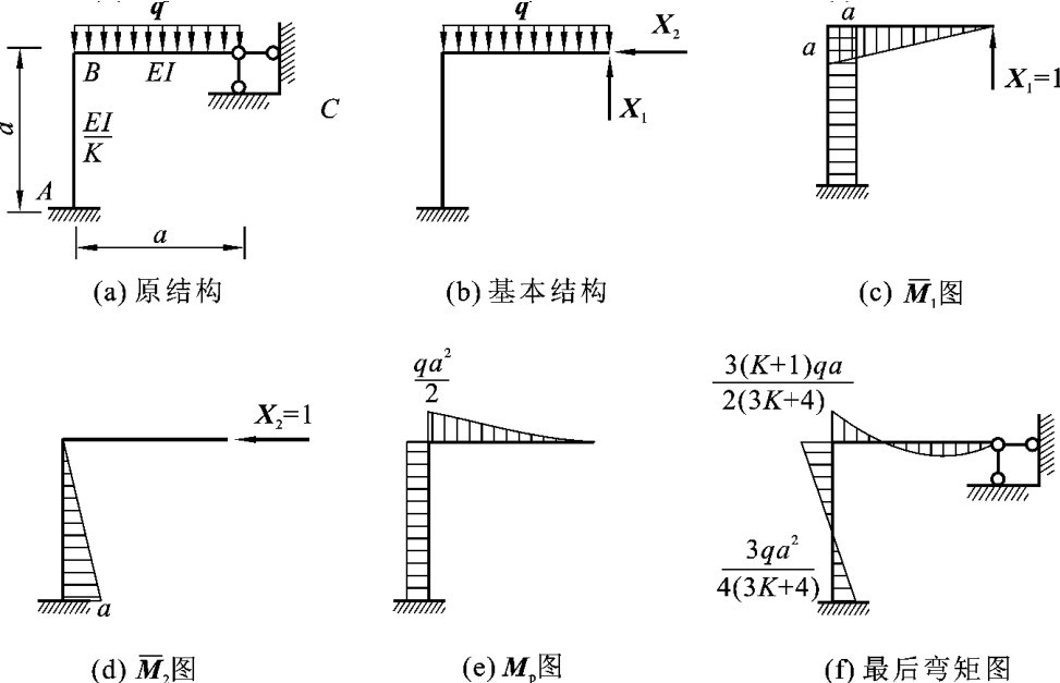 (5)求出多余未知力后,按分析静定结构的方法,绘出原结构的内力图,即最后内力图。最后内力图也可以利用已作出的基本结构的单位内力图和荷载内力图按叠加原理求得。