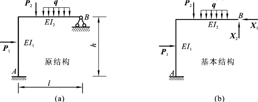 以上我们是以一次超静定梁为例来说明力法原理的,下面讨论多次超静定结构的情况。如图6-13(a)所示的刚架为二次超静定结构。下面以B点支座的水平和竖直方向反力X1、X2为多余未知力来确定基本结构,如图6-13(b)所示。按上述力法原理,基本结构在给定荷载和多余未知力X1、X2共同作用下,其内力和变形应等同于原结构的内力和变形。原结构在铰支座B点处沿多余力X1和X2方向的位移(或称为基本结构上与X1和X2相应的位移)都应为零,即