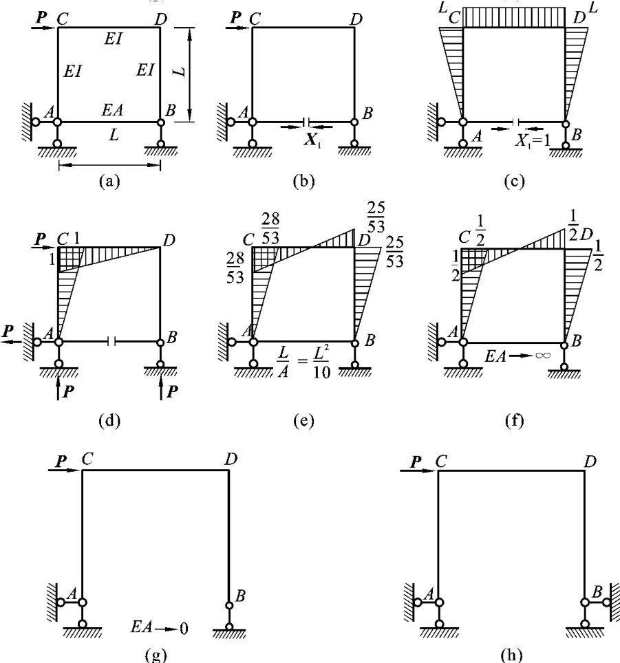 得到M图,如图6-30(f)所示。这时链杆AB相当于一刚性杆,结构可以看成是B端为固定铰支座的刚架,如图6-30(h)所示。