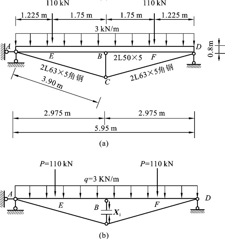 【例6-8】 如图6-26(a)所示为一次超静定的组合结构,求在图示荷载作用下的内力。各杆的刚度给定如下。