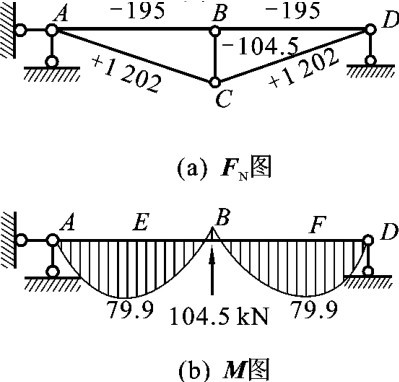 还需指出,这个超静定结构的内力分布与横梁和桁架的相对刚度有关。如果下部链杆的截面很小,则横梁的M图接近于简支梁的M图(见图6-29(a))。如果下部链杆的截面很大,则横梁的M图接近两跨连续梁的M图(见图6-29(b))。