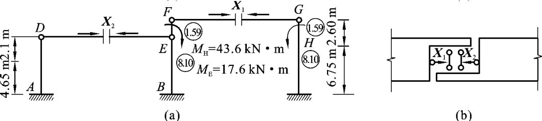 取链杆FG和DE的轴力X1和X2为多余未知力。截断两个链杆的轴向约束,在切口处加上轴力X1和X2,得出基本体系如图6-24(b)所示。