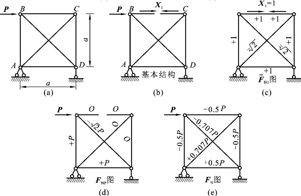 【例6-6】 用力法计算如图6-22(a)所示桁架各杆的轴力。设各杆EA为常数。