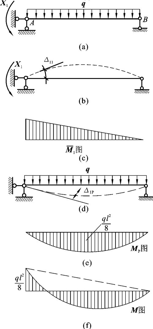 如图6-11(b)所示的基本结构上的B点,其位移应与原结构相同,即ΔB=0。这就是原结构与基本结构内力和位移相同的位移条件。基本结构上同时作用有荷载和多余未知力X1,称其为基本体系。我们可以把基本体系分解成分别由荷载和多余未知力单独作用在基本结构上的这两种情况的叠加(见图6-11(c)和图6-11(e)的叠加)。