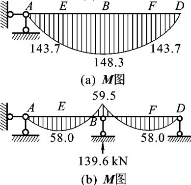 由图6-28(b)可以看出,横梁AD在中点B受到下部桁架的支承反力为104.5kN,这时横梁最大弯矩为79.9kN·m。如果没有下部桁架的支承,则横梁AD为一简支梁,其弯矩图如图6-29(a)所示,其最大弯矩为148.3kN·m。可见,由于桁架的支承,横梁的最大弯矩约减少了46%。