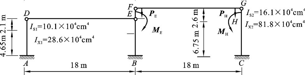 竖向荷载PH=108kN,PE=43.9kN。由于PH、PE与下柱轴线有偏心距e=0.4m,因此在H、E点的力偶荷载为MH=e PH=43.2kN·m,ME=ePE=17.6kN·m。