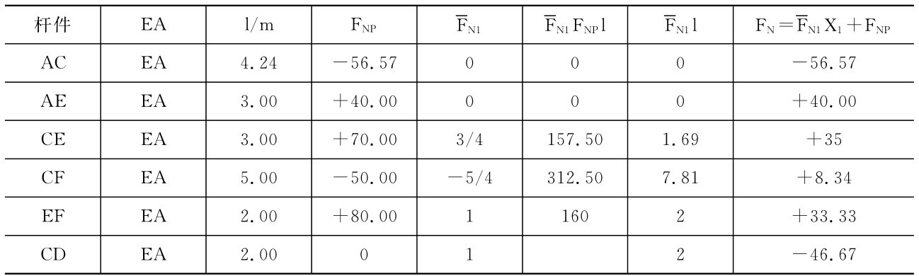 (5)利用叠加公式FN=FN1X1+FNP计算轴力。各杆轴力结果如图6-22(e)所示。