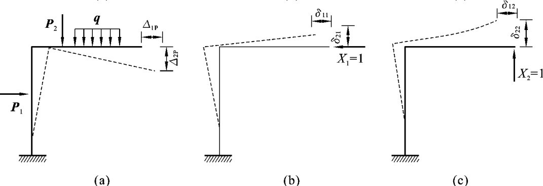 如图6-14所示,Δ1P表示基本结构上多余未知力X1的作用点沿其作用方向,由于荷载单独作用时所产生的位移;Δ2P表示基本结构上多余未知力X2的作用点沿其作用方向,由于荷载单独作用时所产生的位移;δij表示基本结构上多余未知力Xi的作用点沿其作用方向,由于
