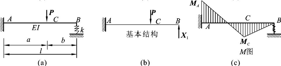 由上式可以看出,由于B端为弹簧支座,多余力X1的值不仅与弹簧刚度k值有关,而且与梁AB的弯曲刚度EI有关。当k=∞时,相当于B端为刚性支承情形,此时